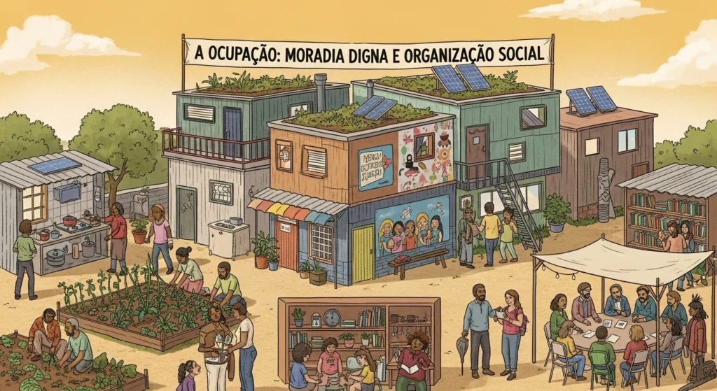 A ocupação é um ato político organizado de famílias sem moradia que reivindicam o direito constitucional à habitação em propriedades que não cumprem sua função social. Invasão é um termo pejorativo que ignora o contexto de crise habitacional e a legitimidade da luta por moradia. Ocupações organizadas seguem princípios de coletividade, transparência e respeito, buscando sempre a regularização.