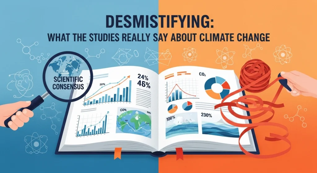 Um estudo particularmente robusto, publicado em 2013 e liderado por John Cook, examinou mais de 12.000 resumos de artigos científicos sobre clima publicados entre 1991 e 2011. Dos artigos que expressaram uma posição sobre a causa do aquecimento global, 97,1% endossaram a posição de que humanos estão causando o aquecimento. Estudos subsequentes confirmaram esses números, alguns encontrando consenso ainda maior quando focam especificamente em cientistas com expertise ativa em pesquisa climática. Desmistificando a ideia de que há debate científico significativo sobre as causas básicas das mudanças climáticas, esses dados revelam uma concordância rara em qualquer campo científico.